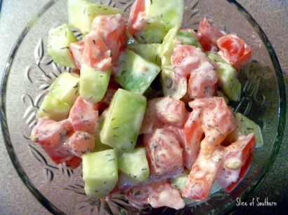 Seed and dice tomatoes. Peel and cube cucumber. Place tomatoes and cucumbers in a medium bowl.