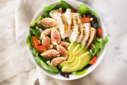Over the top of the salad, add the quartered figs, sliced chicken, and then the sliced avocado. Add apple slices if using.