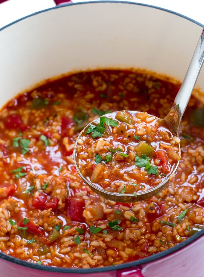 Stuffed Pepper Soup loaded with spicy sausage, bell peppers and rice! Everything you love about a stuffed pepper but in soup form!