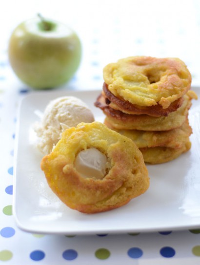 Once oil is hot, fry apples in small batches, about 2 minutes per side. Transfer the cooked fritters to a paper towel lined tray and repeat frying the rest.