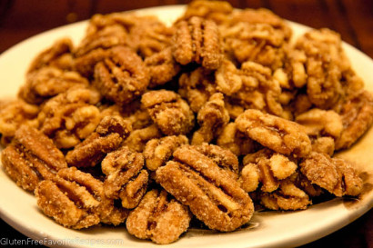 Glazed nuts are an easy treat to stir up when unexpected guests drop by and you want to serve them something special. The sweet vanilla aroma will make your mouth water while you are cooking these. Movie night munchies, quick homemade gift, or travel snack … these crunchy sweet nuts fit the bill. I often make them with 1 cup of walnuts and 1 cup of pecans.