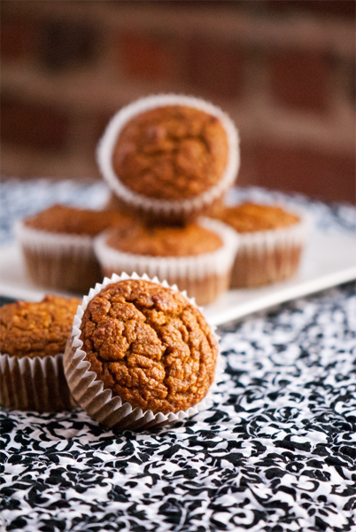 Pumpkin muffins that are grain free and low in sugar with a slight soft and chewy texture.