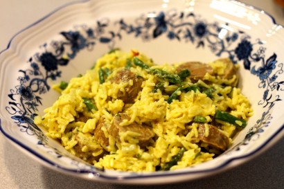 This is a quickie meal that can be made in 15 minutes. Very tasty basmati rice with vegetarian sausages and the vegetable of your choice.