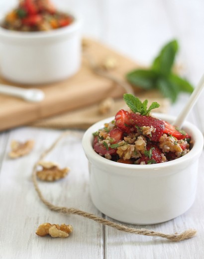 Combine bulgur, herbs, bell pepper, strawberries and walnuts in a small bowl and toss together.